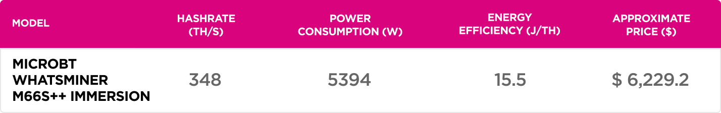 WhatsMiner M66S++ Immersion is a 2025 model that features the best engineering solutions for long-term uninterrupted operation, which is crucial for large mining farms.