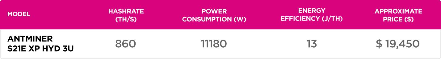 Antminer S21e XP Hydro 3U is an advanced version of the Antminer S21e XP Hydro. This model is an excellent choice for large-scale mining farms due to its: