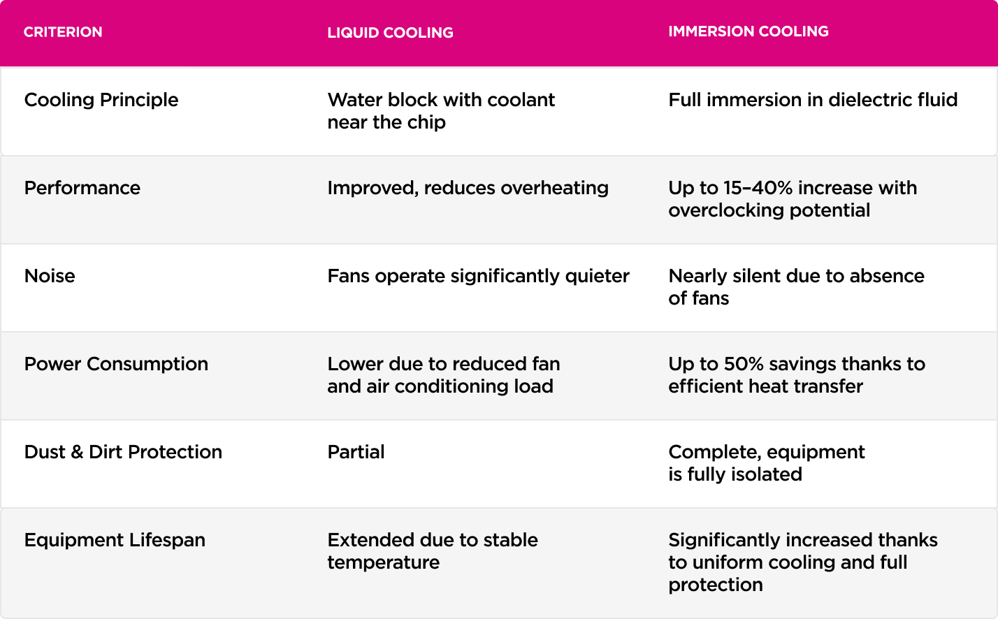 Thus, hydro cooling is an efficient and less radical solution that reduces noise and energy consumption while maintaining the conventional format, whereas immersion cooling provides even greater performance, protection, and savings but requires a specialized immersion system.