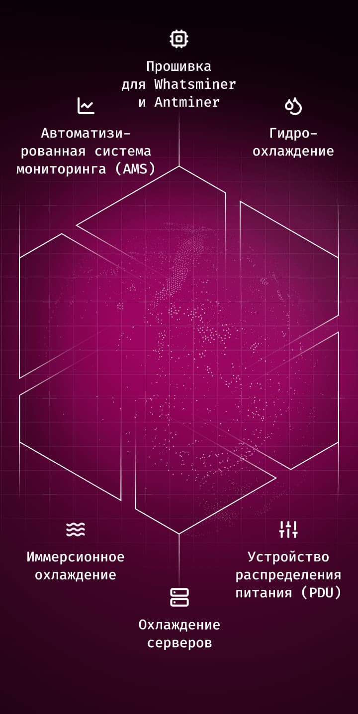 Майнинг-комплексы BiXBiT размещаются в стандартных ISO контейнерах, предназначенных для крупных майнинговых операций в районах с избыточной электроэнергией. Поддерживается удалённое управление оборудованием.