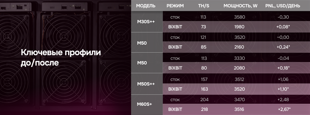 *в расчете доходности с использованием прошивки BiXBiT учтена комиссия разработчика, равная 2.8%